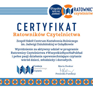 Wraz z początkiem wakacji dotarła do nas bardzo dobra wiadomość o przyznaniu naszej szkole Certyfikatu Ratowników Czytelnictwa. Tym samym zakończyliśmy trwający od października do maja (ubiegłego już roku szkolnego) projekt o nazwie Ratownicy Czytelnictwa, prowadzony przez Fundację Powszechnego Czytania i realizowany pod hasłem „Wszystkie ręce na pokład”. Oznacza to, że do proponowanych działań projektowych zapraszani byli uczniowie, nauczyciele i pozostali pracownicy szkoły oraz rodzice.