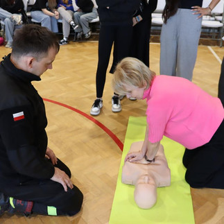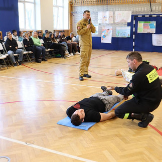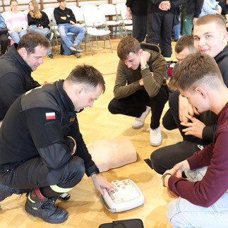 Państwowa Straż Pożarna poprowadziła dla nas wykład na temat udzielania pierwszej pomocy przedmedycznej, a następnie mieliśmy okazję sprawdzić swoje umiejętności w praktyce. Ćwiczyliśmy resuscytację krążeniowo-oddechową, udzielanie pomocy przy zadławieniach, tamowanie krwotoków i opatrywanie ran, a także postępowanie w przypadku omdleń.