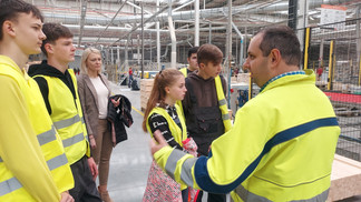 Po przybyciu na miejsce powitała nas serdecznie pani Joanna Groszkowska - dyrektor HR oraz pan Mateusz Równy - manager jakości firmy. Pani dyrektor zaprosiła nas na słodki poczęstunek i ciekawie przedstawiła historię i profil działalności firmy. Zwiedzanie rozpoczęliśmy od sortowni, gdzie odpowiednie kłody drewna trafiają na obróbkę. Zobaczyliśmy jak wygląda proces cięcia, suszenia, szlifowania, wiercenia, frezowania i lakierowania drewna.