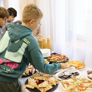 Następnie z pomocą naszych uczniów i pod czujnym okiem nauczycieli (pani Edyty Żychowskiej i Izabeli Sieńkowskiej) szóstoklasiści przygotowali pyszne i zdrowe śniadanie. Na stole znalazły się między innymi: „szrekowe” naleśniki, gofry, tortille z serka wiejskiego, ciasteczka owsiane i świeżo wyciskany sok z jabłek.